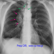 A 38-yo male, non-smoker, had a recurrent malignant chondrosarcoma (measuring 6.6 × 5.4 × 2.9 cm) located at the superior part of his sternum.