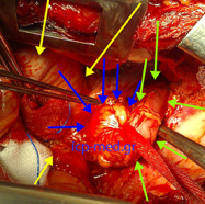 10. Intraoperatively Post repair: there is no longer any part of the stomach inside the chest (BLUE: oesophagus, YELLOW: the hiatus of the diaphragm)