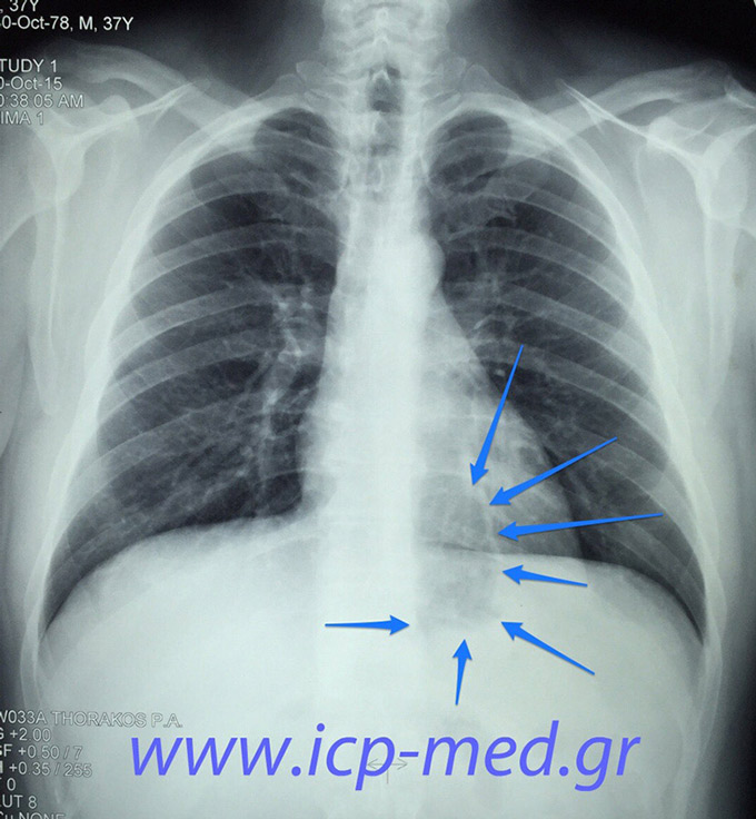 2. The same preop CXR. Arrows: intrathoracic part of stomach, missed earlier by many